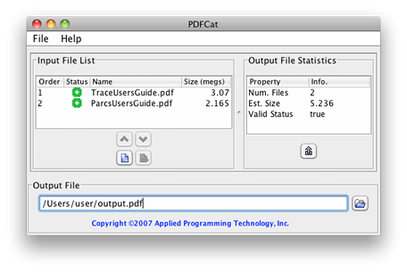 The PDFCat application merges a series of PDF files into a single file while preserving bookmarks. This Java based application can be run interactively or in batch mode. Interactive mode consists of a tabular view of input files along with output file statistics. Merge controls are included which allow the user to adjust the order in which the PDF files are merged.